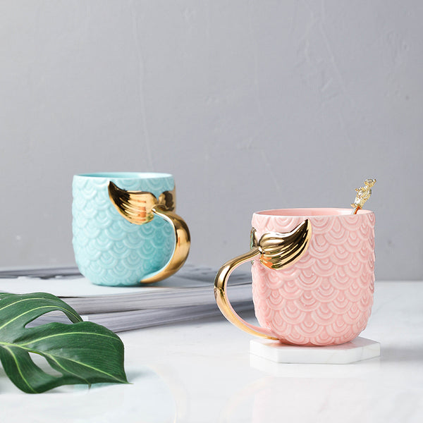 This eye-catching ocean offering deserves a spot in your glassware collection. This ceramic mug is decorated with textured pastel scales on its body and a golden mermaid tail as its handle. Great for your beach or seaside home or as a gift for an ocean-lover friend, this sea-inspired mug can work as a functional vessel for coffee and as a decorative catch-all for all those thingamajigs. Available in pastel blue and pastel pink, in a set of two or as one piece mug.
