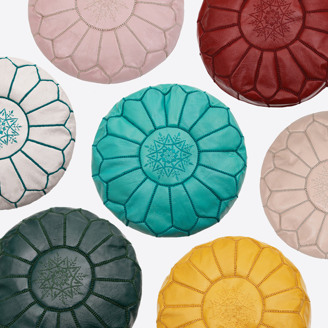 Ideal as a footstool or for additional seating, our amazing poufs are in their element in almost any room of the home. Handmade in Morocco by traditional leather craftsmen, each piece is unique, and subtle variations in colour are part of the charm. Individual sections of leather are dyed to perfection, before being stitched together and embroidered by hand. Our poufs are pre-stuffed with soft inners, so they're comfortable and ready to use out of the box. It's a beautiful item that will last for years to come. Our poufs are available in a wide range of colors.