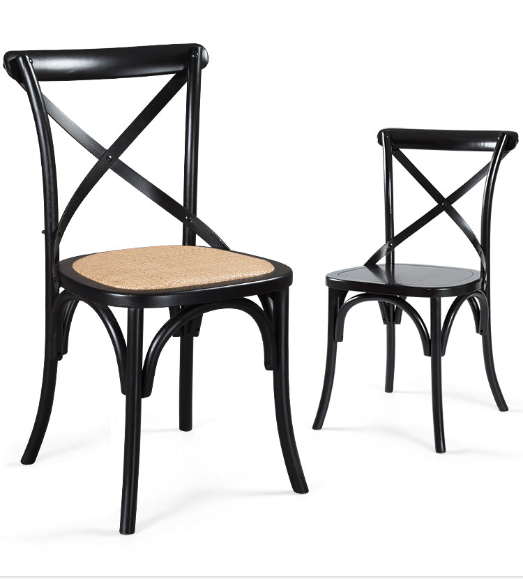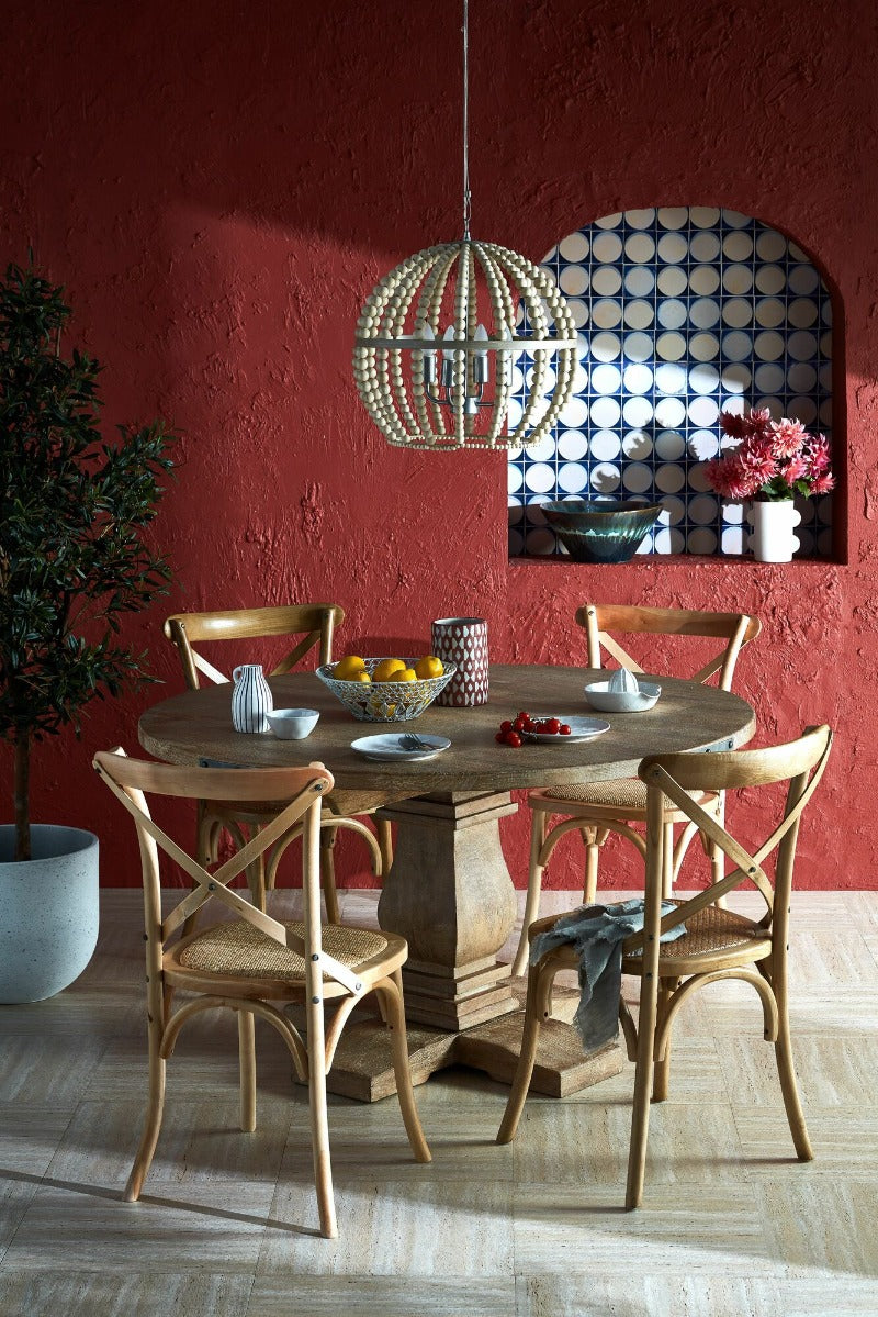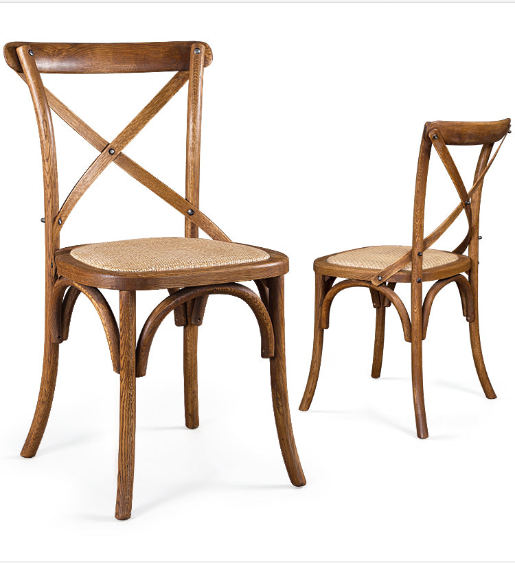 The cross-back country chair has a lovely organic feel to it. Soft curves of oak wood in a weathered vintage finish and rattan seat conspire to add charm and character to any living room. The light colour makes it an easy match with eclectic interiors or even to soften a modern look. Great as dining chair or solo in the bedroom or entrance hall.
