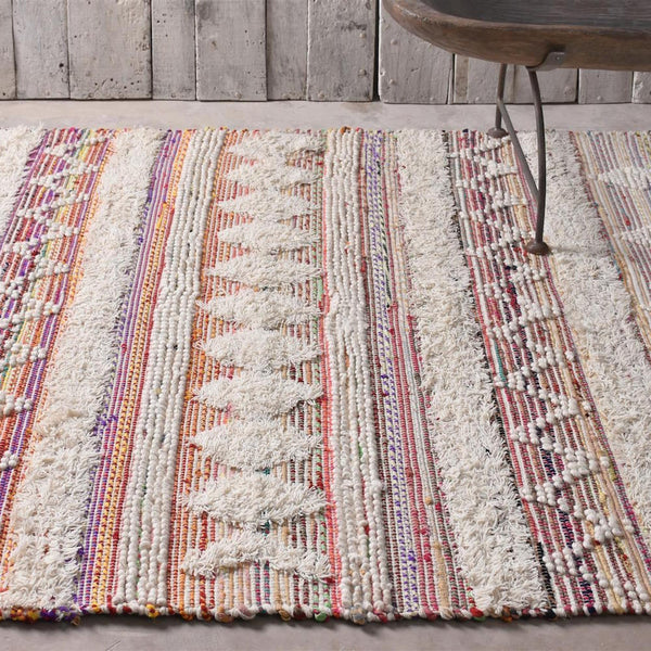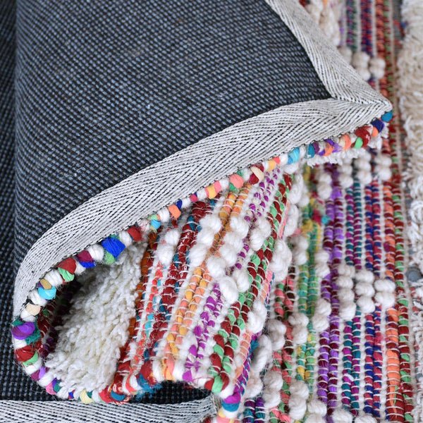 - Care: This rug is handmade from up-cycled fabric. Each piece is unique, and colors and textures may vary slightly. Deep colors may stain light surfaces especially if wet. Use soft hand brush and light vacuum to clean. Avoid using a beater brush. Remove any spills immediately - blot the liquid with a clean cloth or a paper napkin. Do not pull loose ends if any - instead trim with scissors. Keep away from sharp objects, hot surfaces, open fireplaces, and excess moisture. Do not soak the rug in any liquid. For initial weeks, shedding of material fiber may be observed. This is normal and will reduce over time and with use. Colors may fade slightly when placed in areas of direct sunlight, so it is recommended to periodically rotate your rug to ensure the effect is even.