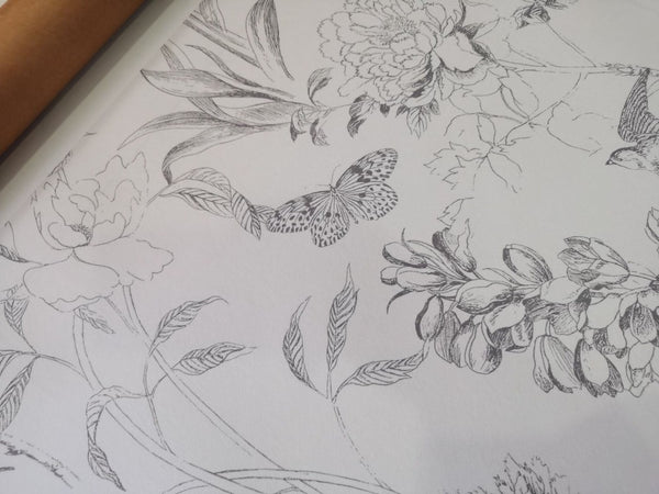 Nature themes and bringing the outdoors indoors has been a real interiors trend of late. But who said it had to be green - what if you need a more neutral tone? This nature inspired wall mural features a hand drawn style sparrows, butterflies and plants - but in monochrome. Great for a space where you have other color themes, and you need a neutral tone. To work out how much you'll need, just follow the simple instructions below. We'll custom size for your wall and ship worldwide for free.