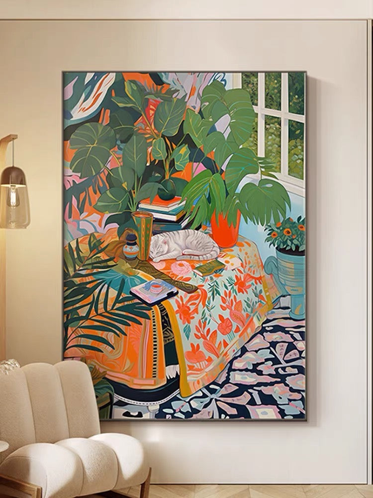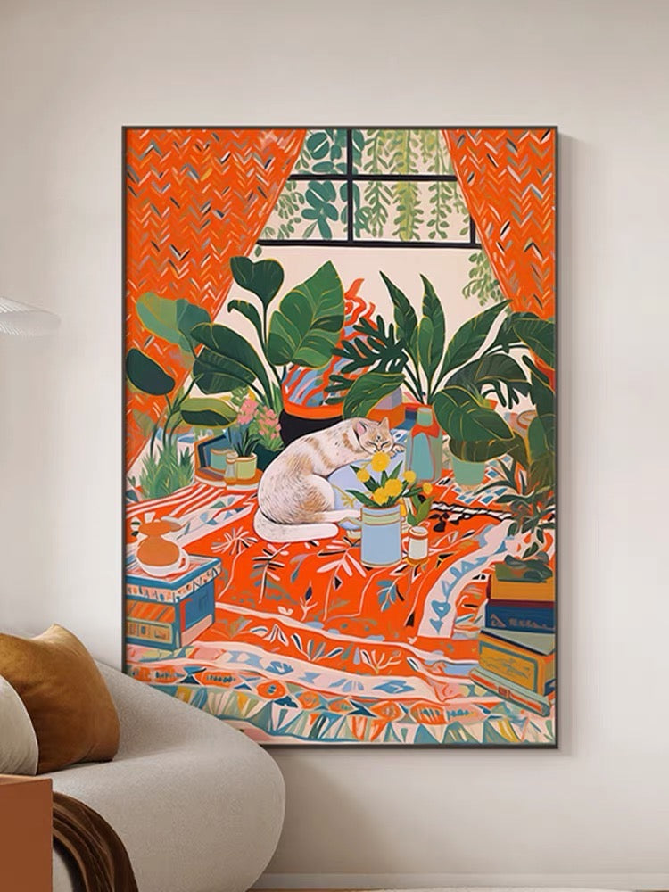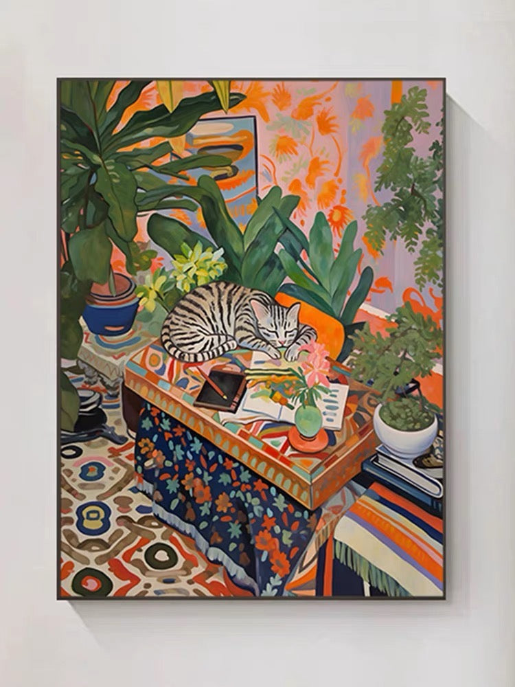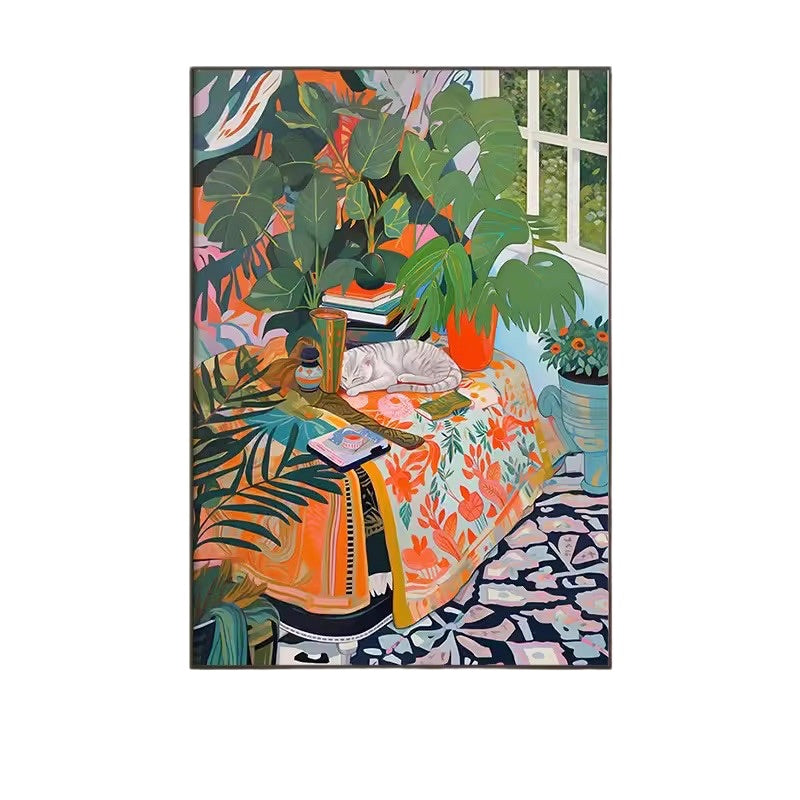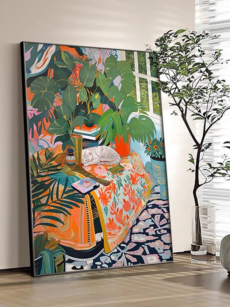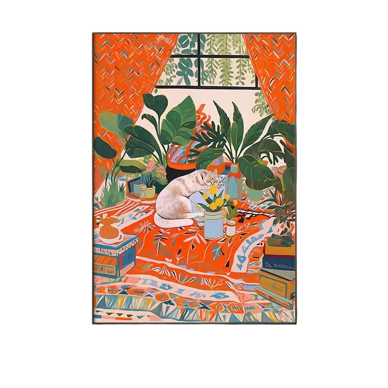 Our Bohemian Sleeping Cat Illustration Wall Art with Frame promises to infuse your living space with charm and tranquility. A scene alive with vibrant colors, showcasing a contented cat nestled amidst lush greenery, evoking a sense of peace and serenity. Crafted to uplift your mood and transform your living room, bedroom or a hallway, this delightful piece is available in three distinctive styles, each capturing the essence of Bohemian aesthetics in its own unique way. This print wall art comes in four different sizes, allowing you to find the perfect fit for your home or office decor. With options ranging from small and subtle to large and striking, you can effortlessly customize your space to reflect your personal style. To make decorating a breeze, each piece comes ready to hang, complete with your choice of a sleek black frame or an elegant gold frame. Simply select your preferred style, size, and frame color, and let our Bohemian Sleeping Cat Illustration Wall Art add a touch of whimsy and charm to your surroundings.
