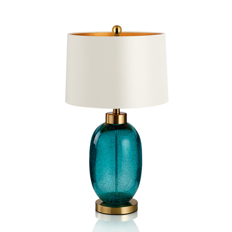 Brighten up your space with the Elegant Blue Glass Table Lamp—where vibrant design meets sophisticated elegance. This lamp is a true standout piece for any stylish modern interior. The vibrant blue glass base, adorned with fine bubbles, creates a beautiful texture that catches the eye. This deep blue base is perfectly complemented by a matte gold trim and a crisp white shade, resulting in a visually stunning combination. Whether you’re looking to enhance your living room, bedroom, or study, this lamp is the perfect addition.